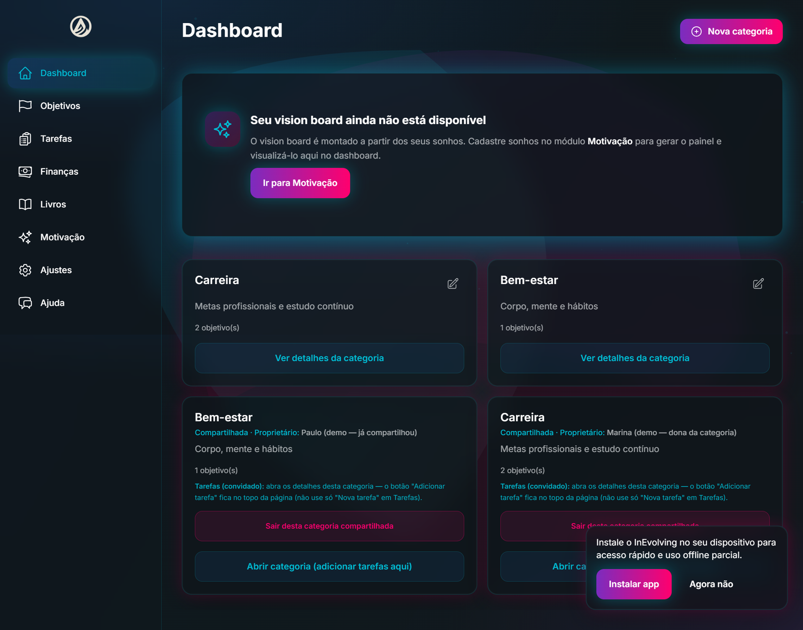 InEvolving está em produção: dashboard, tarefas com kanban, finanças, livros, motivação e categorias colaborativas — interface glass, animações fluidas e experiência pensada primeiro para o celular.